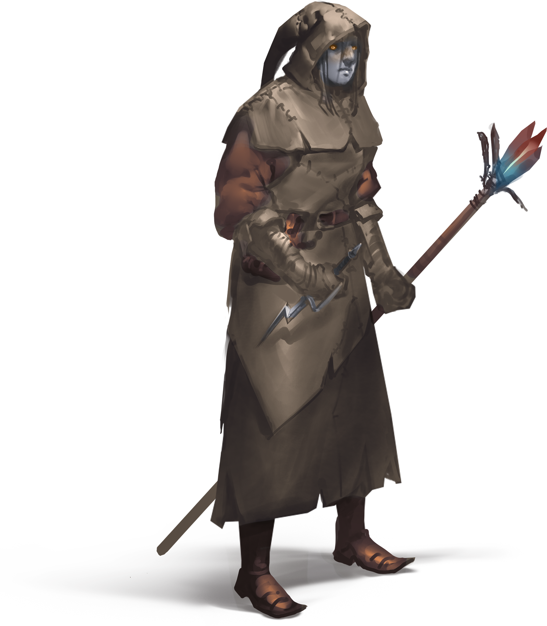Колдун в плаще на службе банды, вооружённый посохом и набором странных чар.