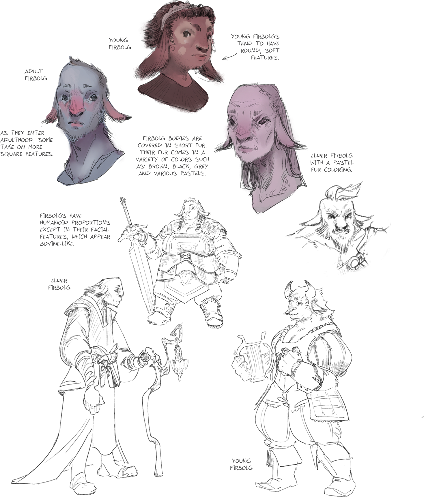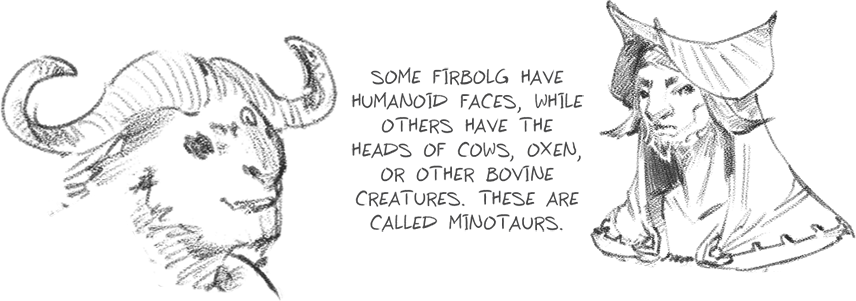 Фирболги — это гуманоиды с чертами быков, обычно узнаваемые по широким носам и длинным, свисающим ушам.