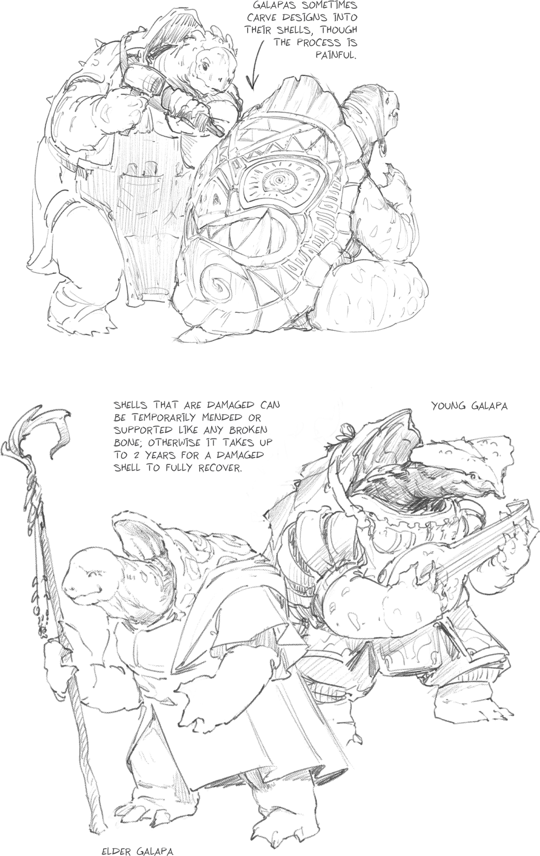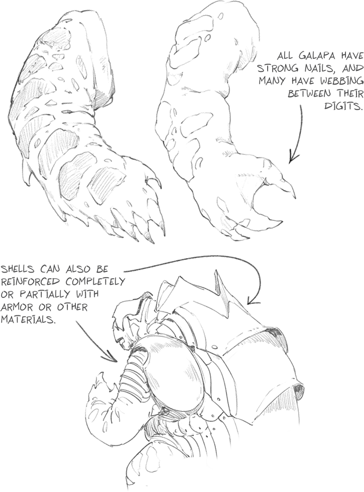 Галапы иногда вырезают узоры на своих панцирях, несмотря на сильную боль от этого процесса. Панцирь может быть частично или полностью усилен бронёй или другими материалами. Повреждённый панцирь можно временно закрепить, как переломанную кость, но его полное восстановление занимает до двух лет. У всех галап крепкие когти, а у многих есть перепонки между пальцами.
