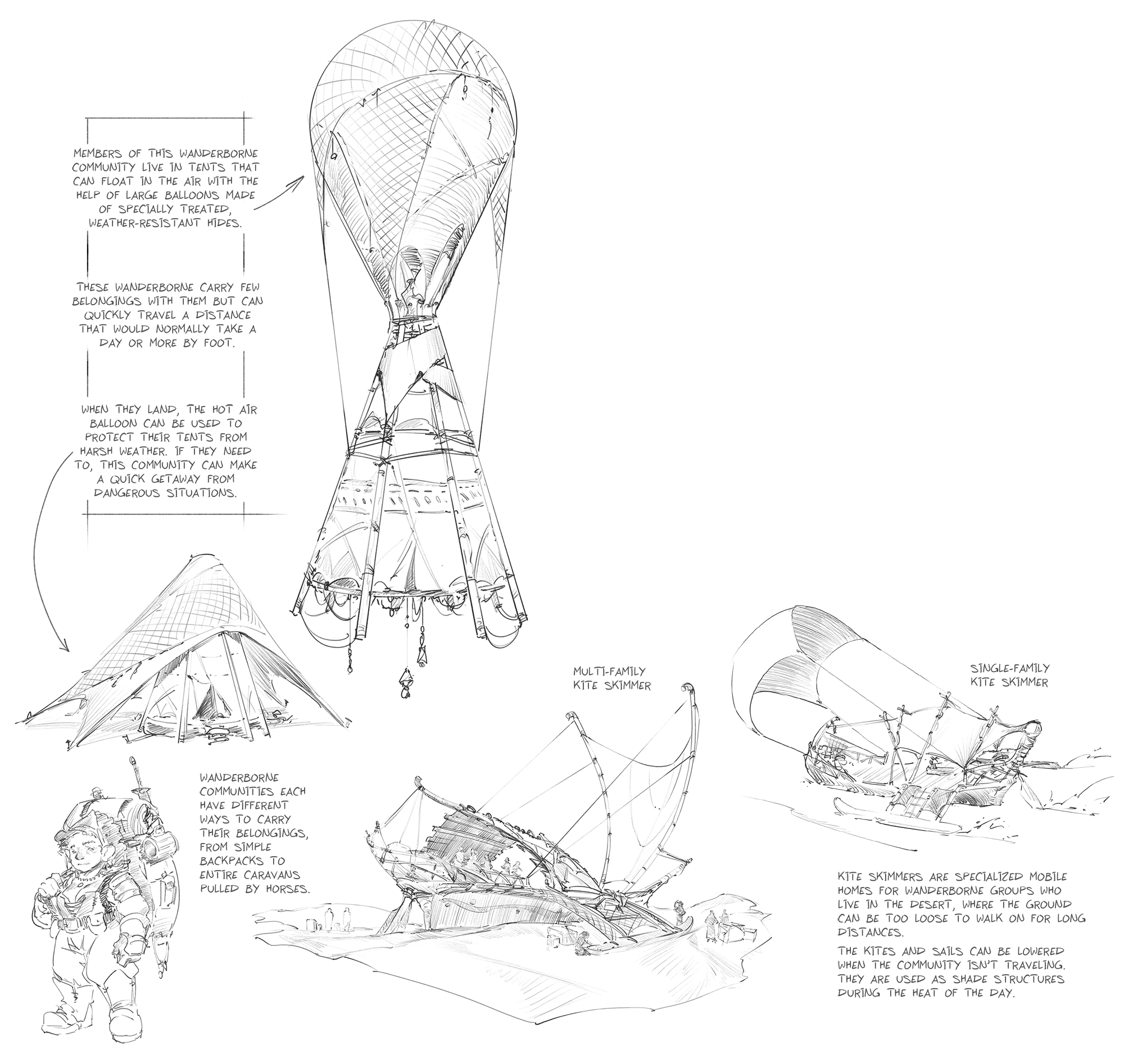 Члены этого кочевого сообщества живут в палатках, которые могут парить в воздухе с помощью больших воздушных шаров, сделанных из специально обработанных, устойчивых к непогоде шкур. Эти кочевники берут с собой немного вещей, но могут быстро преодолеть расстояние, на которое пешком обычно уходит день или больше. Когда они приземляются, воздушный шар можно использовать для защиты палаток от непогоды. При необходимости такое сообщество может быстро покинуть опасные места.