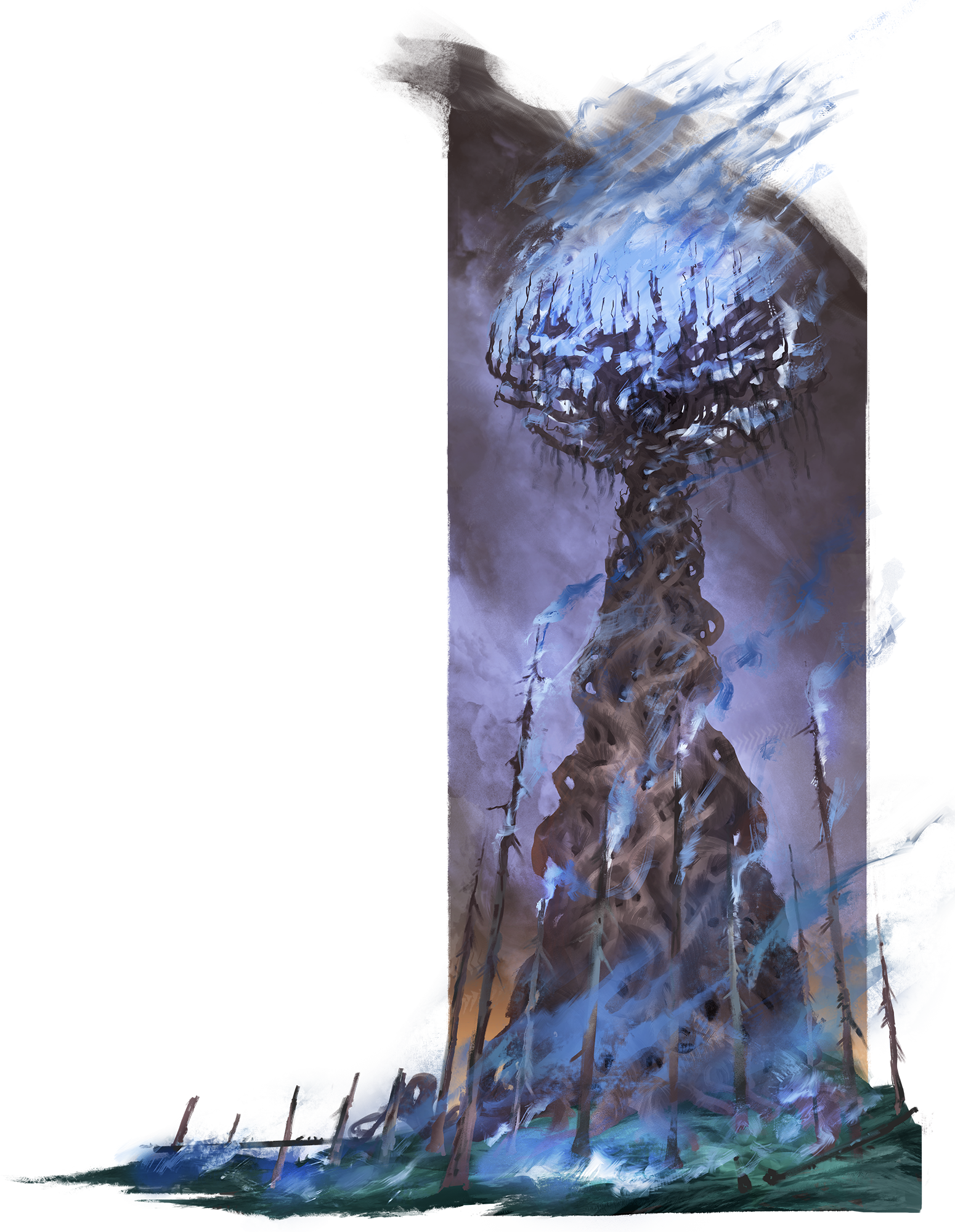 Массивное, покрытое мхом дерево горит синим пламенем. Пепел искажения наполняет воздух.