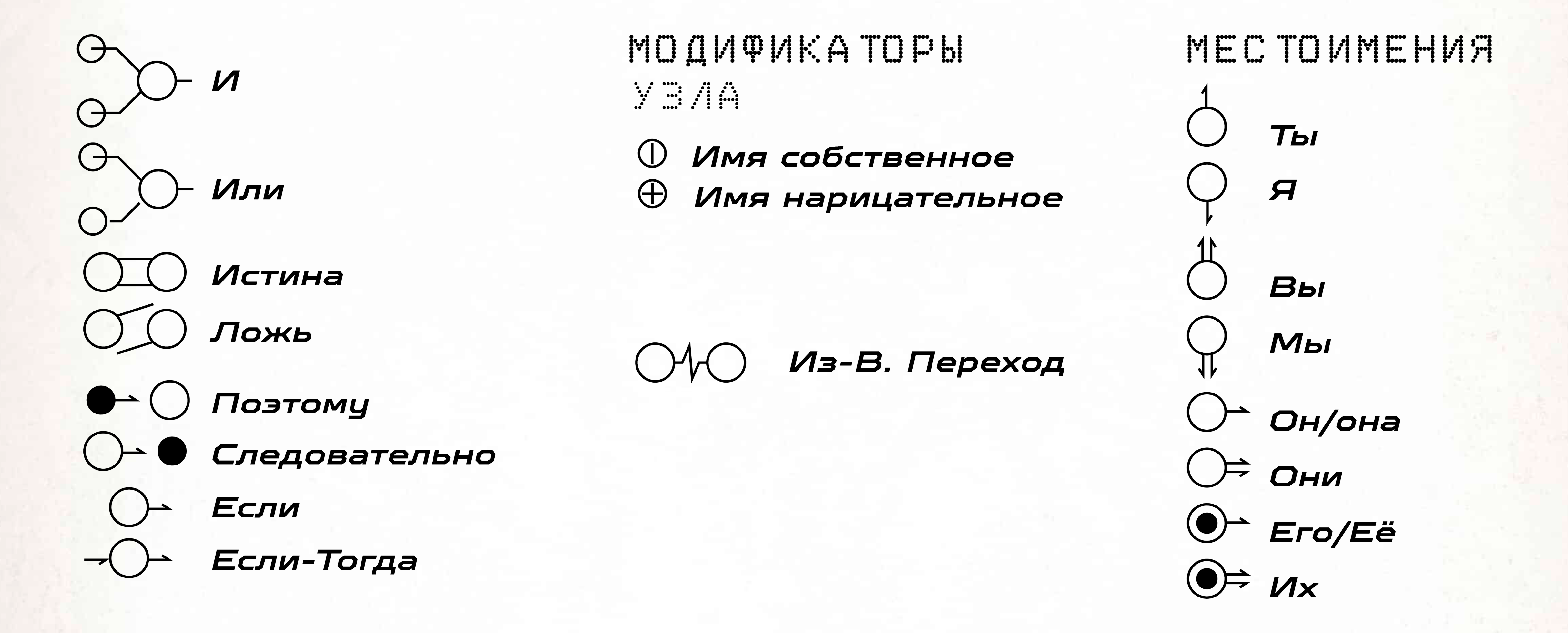 Составные слова иногда содержат слишком мало узлов, поэтому их ориентация на сетке из девяти узлов является неопределенной. Например, такие слова, как Лом, Труп и Друг, требуют всего двух узлов. В таких случаях мы добавляем нулевой модификатор в удаленный угол глифа, чтобы указать относительное положение узлов, входящих в слово.