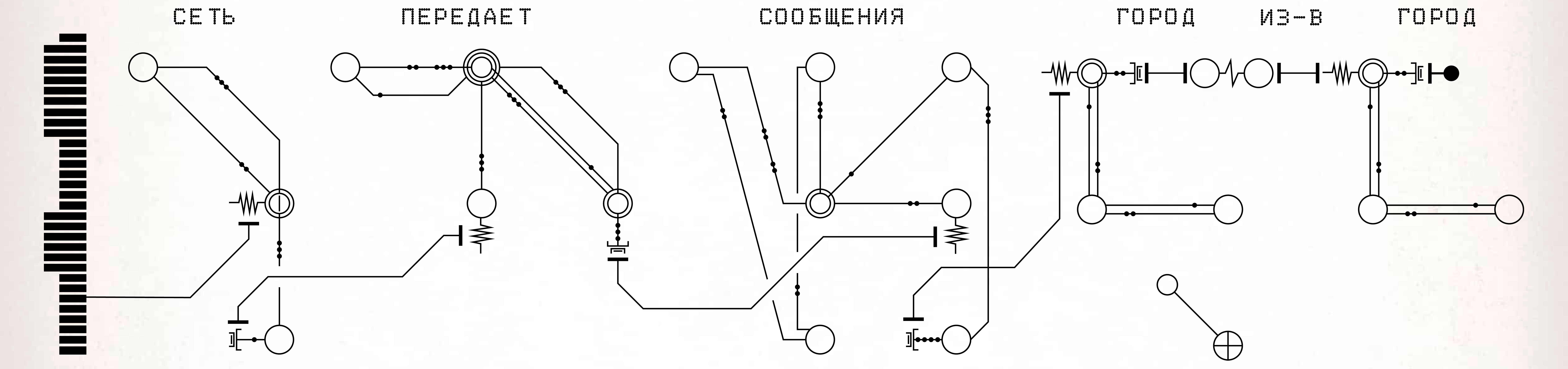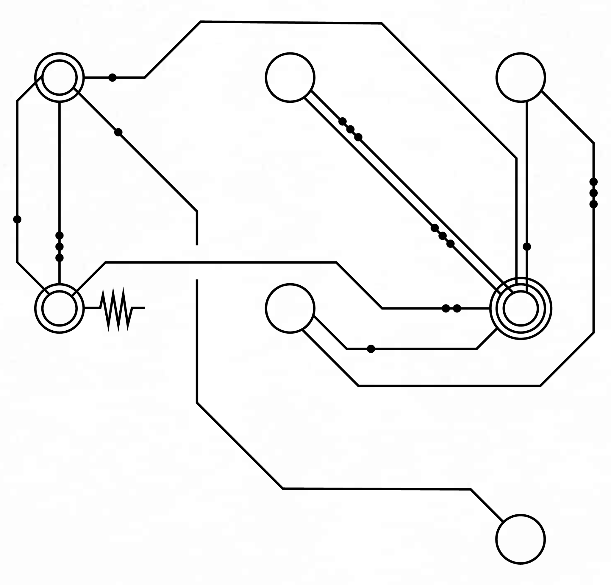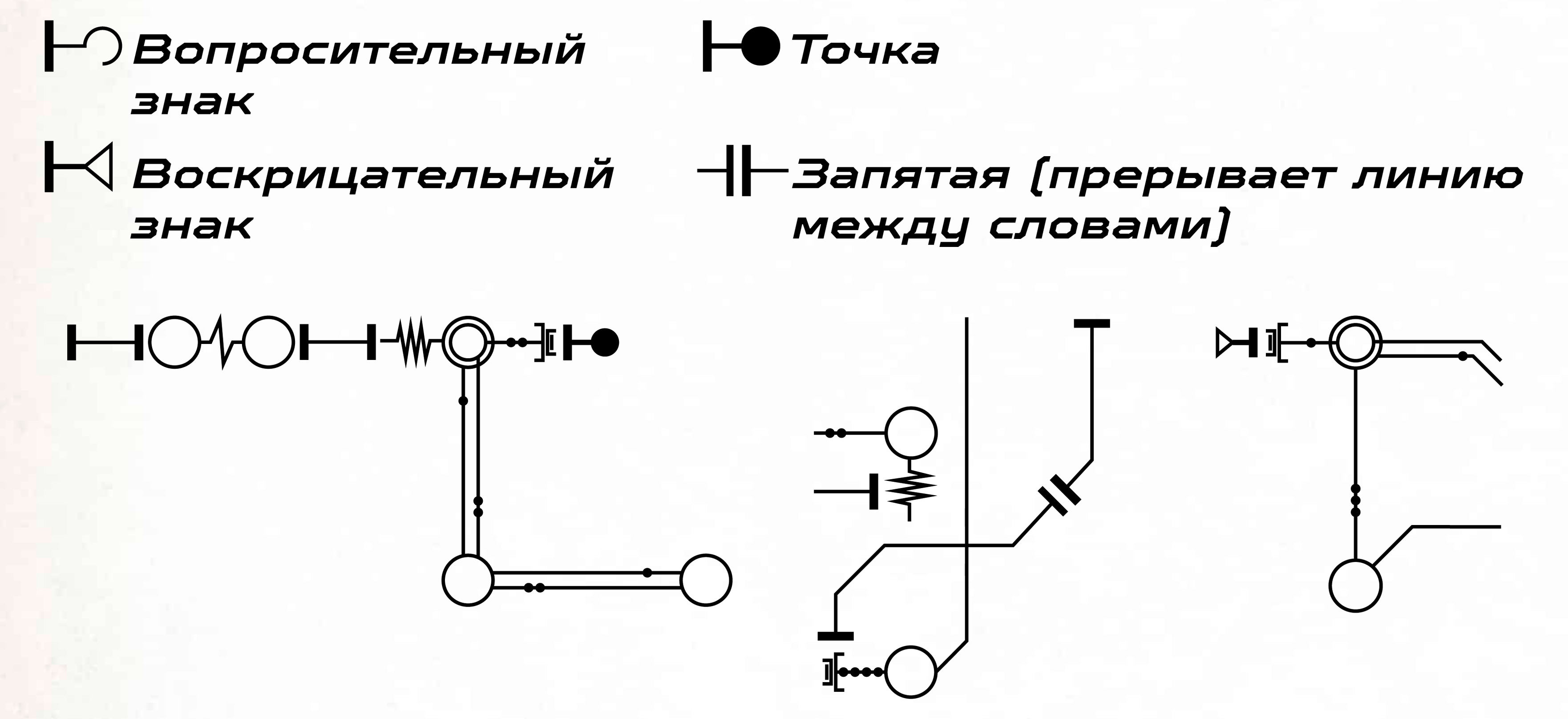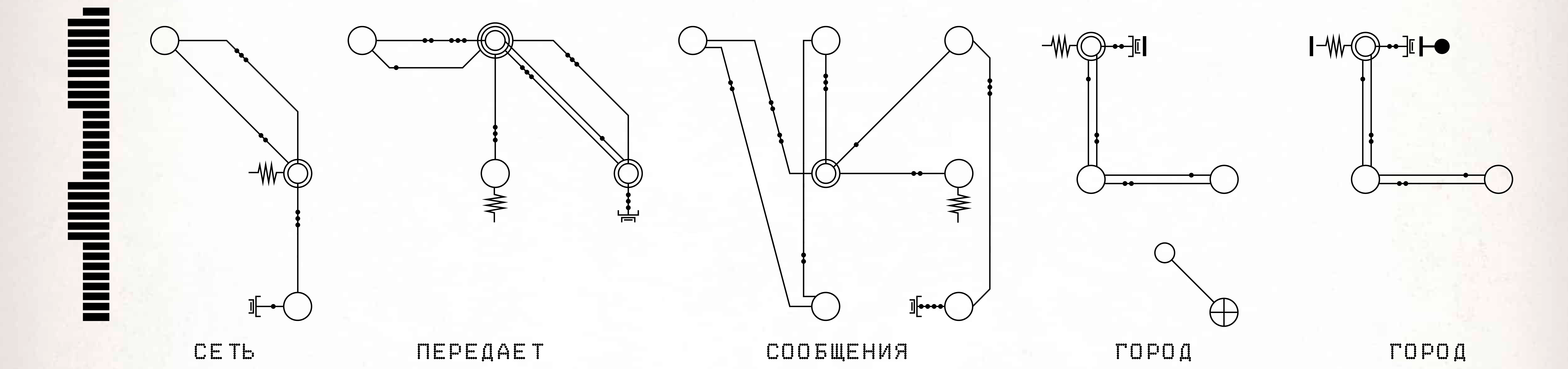 Во-первых, мы обозначаем начало предложения с помощью соединителя, сложной серии точек пайки, где кходеры могут соединять одну цепь предложения с другой. Пример соединителя можно увидеть здесь; различная длина его полос не имеет никакого значения.